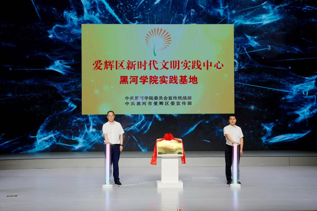 本网讯(记者 太译彬 摄影 陈虹旭)6 月 29 日,“爱辉区新时代文明实践中心黑河学院实践基地” 揭牌仪式在爱辉区新时代文明实践中心举行。爱辉区委副书记李志国,爱辉区委宣传部常务副部长常彬强,爱辉区委宣传部副部长崔京京;校党委副书记安全义,党委委员、宣传统战部部长高孝成出席仪式,音乐学院党总支书记崔安宁及校区双方相关部门负责同志,学校民主党派及留学人员联谊会教师代表共同参加仪式。