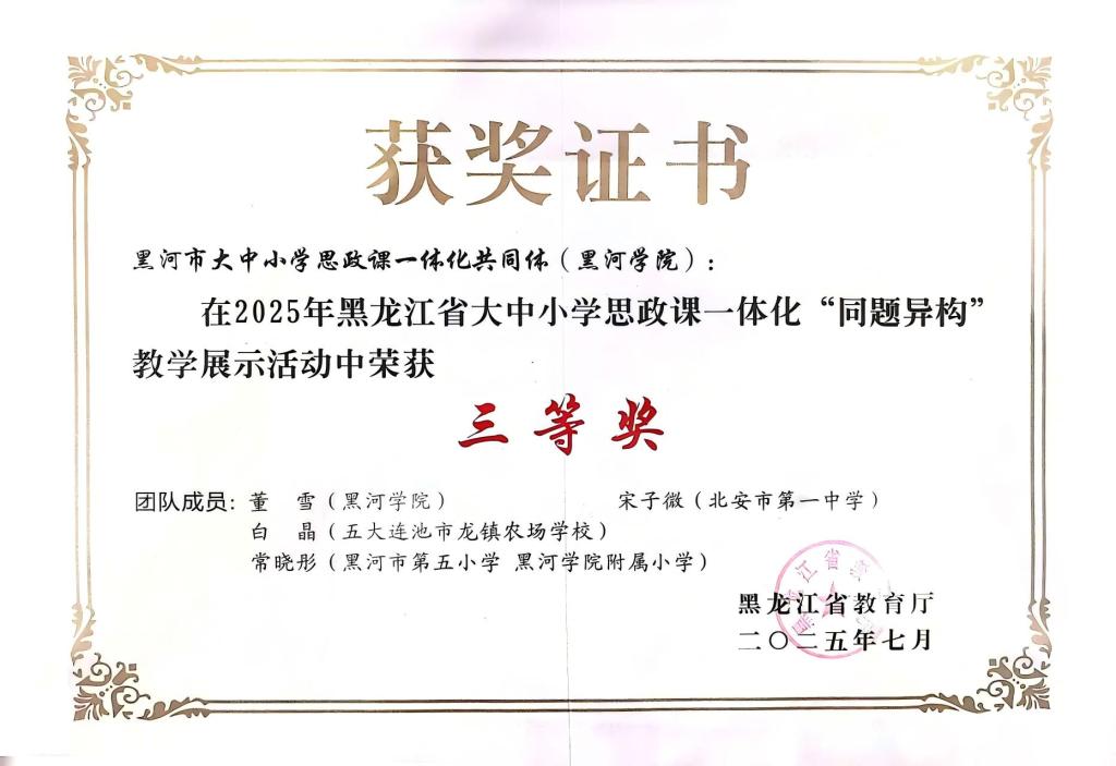 近日,黑河市大中小学思政课一体化共同体(黑河学院)凭借扎实的教学设计与出色的现场表现,在2025年黑龙江省大中小学思政课一体化“同题异构”教学展示活动决赛中,荣获三等奖。