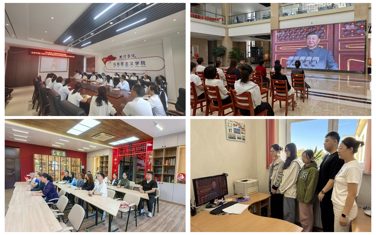 党委副书记、院长杨敬民:今天,中国人民抗日战争暨世界反法西斯战争胜利80周年大会在京隆重举行。习近平主席指出:“历史承载过去,也启迪未来。”我们铭记历史,是为弘扬爱国主义与抗战精神,汲取奋进力量。黑河学院作为中俄边境线上我国唯一本科高校,将紧扣国家“五大安全”和向北开放战略,充分发挥对俄合作“桥头堡”和“枢纽站”的区位优势,积极构建中俄教育合作高端平台,打造一批具有国门特色、国际水准的合作项目。深化产教融合,增强服务边疆发展能力,着力建设立足北疆、面向全国、应用型、国际化的高水平高校,为筑牢北疆安全屏障、构建我国向北开放新高地注入持久动能、提供坚实支撑。