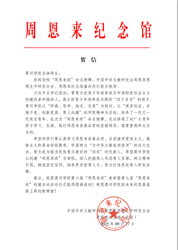 “周恩来班”创建活动不仅是一项承载特殊历史意义与深厚期望的荣誉传承,更是我校落实立德树人根本任务、推进校园文化建设的重要举措。未来,我校将积极打造“北疆冰凌”思政育人品牌,引导学子在实践中深切体会“一朝学周、一生受益”的深远意义,在奋进青春、开拓人生、奉献社会的进程中,书写无愧于时代的崭新篇章。