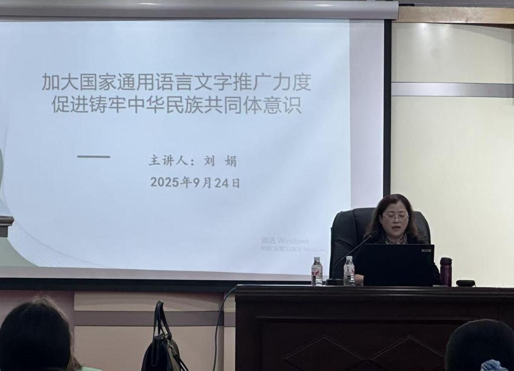 9月24日,国家语言文字推广基地大讲堂第四讲在明德楼多功能厅开讲。国家级普通话水平测试员、黑龙江大学汉语言文字学硕士、国家汉办汉语教学专家、人文传媒学院原副院长刘娟老师应邀作题为《加大国家通用语言文字推广力度,促进铸牢中华民族共同体意识》的专题讲座。学校100余名师生现场聆听。