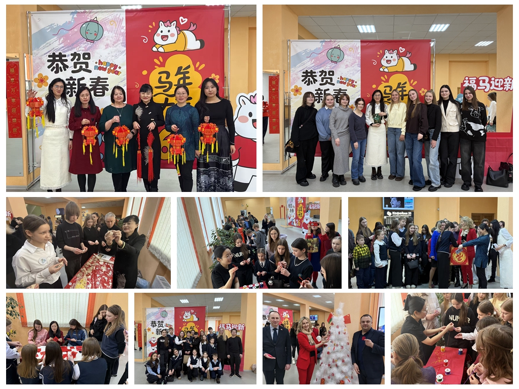 近日,我校与白俄罗斯莫吉廖夫国立大学合作共建的孔子学院举办马年春节中国传统文化体验活动。活动以马年新春为契机,以沉浸式文化体验为载体,吸引上百名当地师生参与,成为中白文化交流的亮丽风景线。 活动现场年味十足,红灯笼、中国结、春联与福字相映成趣,弥漫着饺子的鲜香。孔子学院设置了贴春联、写福字、剪纸、编制中国结、包饺子等多个体验摊位,师生踊跃参与,欢声笑语不断。中外教师细心指导,手把手教学。写福字摊位上,师生认真临摹,脸上洋溢着自豪的笑容;剪纸摊位上,红纸翻飞,精美作品让人赞叹;包饺子环节温馨和睦,师生互帮互助,共同品尝热气腾腾的饺子,感受“。团圆美满”的内涵。“马踏飞燕”跳跃比赛将活动推向高潮,参与者模仿姿态跳跃,传递“新的一年新的飞跃”的美好寓意,掌声欢呼声此起彼伏。