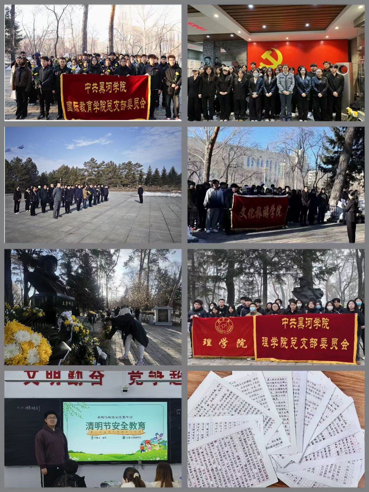 缅怀英烈铸忠魂,红色教育砺初心。各二级学院结合专业特色,将清明祭扫与思政教育深度融合。外国语学院组织党员师生赴中苏抗战历史陈列馆开展主题教育活动,感悟中苏两国人民在反法西斯战争中结下的深厚友谊,以及革命先烈不畏牺牲、保家卫国的崇高精神。经济管理学院、继续教育学院师生代表前往黑河市烈士陵园,向烈士敬献鲜花,缅怀革命先辈的丰功伟绩。理学院召开清明节安全教育主题班会,并组织师生前往王肃公园祭扫烈士墓,表达对革命先烈的深切哀思。国际教育学院师生在王肃烈士墓和苏联红军烈士塔前肃立默哀、敬献鲜花,致敬国际主义精神。文化旅游学院在王肃公园开展祭扫活动,并组织学生撰写祭文,以文字寄托哀思。