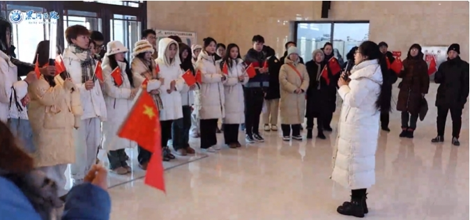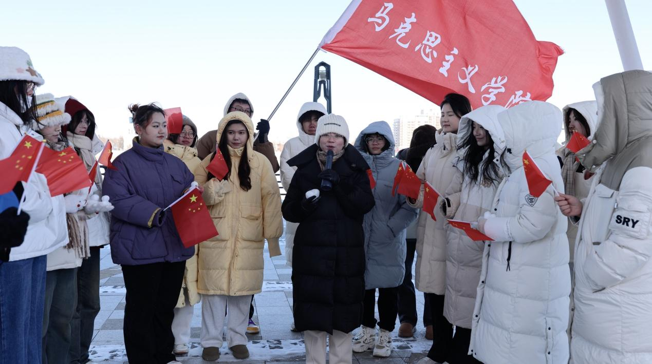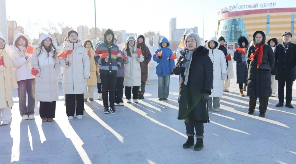 我校的思政课教师站在大黑河岛国旗广场中央,为同学们讲述着广场背后的故事。同学们仰望着五星红旗,眼中闪烁着光芒;这面国旗高56米,旗面长15米,宽10米,是国内最高最大的国旗。有的同学小声议论着:“太震撼了,26天就建成了,这在其他国家简直难以想象。”有的同学则陷入了沉思,似乎在思考社会主义制度的优越性在生活中的其他体现;师生们不仅感受到了国旗的庄严与神圣,更深刻理解了社会主义制度的强大力量。这堂行走在界江边上的思政课,让抽象的制度优势变得具体可感,在同学们心中种下了爱国的种子。
