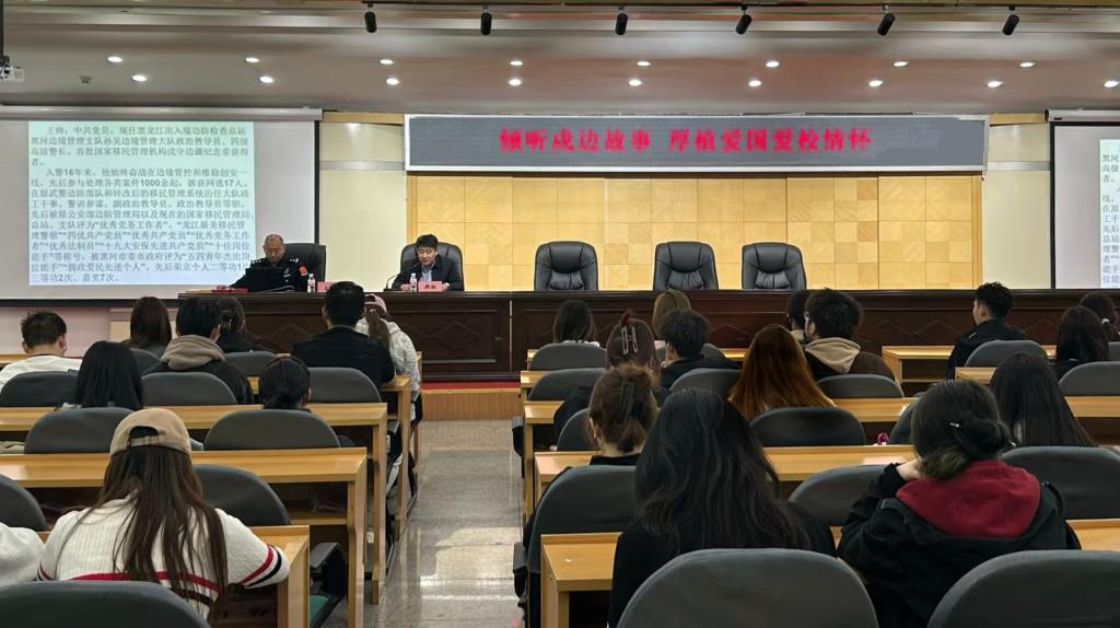 本网讯(特约记者 王佳宜)为进一步推进落实“新时代立德树人工程”,传承红色基因,厚植爱国爱校情怀,增强我校班级干部使命感和责任感,4月27日我校在明德楼5楼多功能厅举办第三期班级干部培训。此次培训是我校与黑河边境管理支队签订合作协议以来的又一次爱国主义教育活动。活动邀请首批国家移民管理机构戍守边疆纪念章获得者,现任黑龙江出入境边防检查总站黑河边境管理支队孙吴边境管理大队政治教导员、四级高级警长王帅来我校分享戍边故事。